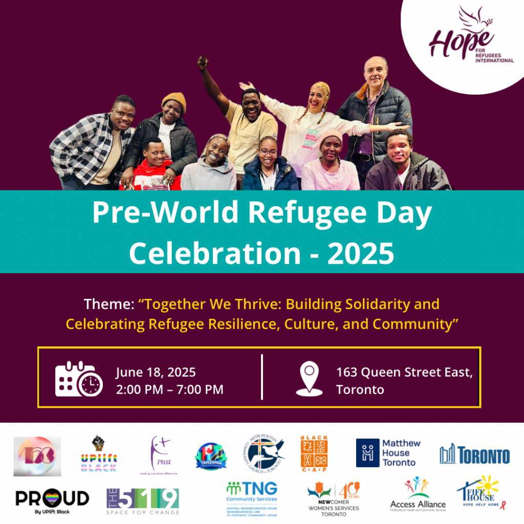 In anticipation of World Refugee Day 2025, Hope for Refugees International and Uplift Black Centre for Social Justice and Inclusion, in partnership with over a dozen community organizations across Ontario—including The 519, Matthew House, Access Alliance, Newcomer Women’s Services Toronto, The Toronto People With AIDS Foundation (PWA), The Neighbourhood Group (Rainbow Connect), COSTI, Metropolitan Community Church, Black CAP, The Krasman Centre, the Tanzanian Women’s Association in Canada, and the Southern Africa Settlement Support Centre—is proud to host a vibrant and powerful Pre-World Refugee Day Community Celebration on June 18, 2025, at 163 Queen Street East in Toronto.